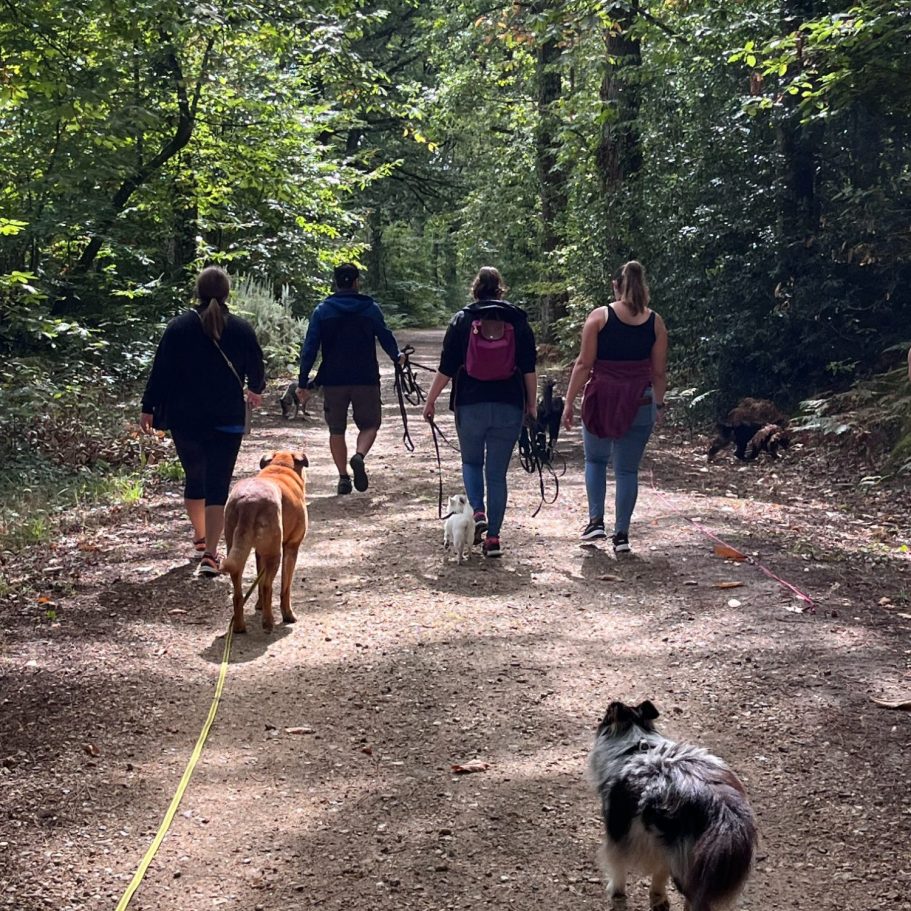 Le mantrailing (pistage d'humains) : demi journée en collectif (maximum 6 chiens), en forêt ou en ville, pas d’âge minimum. Prévoir une tenue adaptée à l’environnement et à la météo, une boîte en verre ou en métal avec une chaussette de la veille, un harnais adapté et une longe de 10 mètres (prêt possible). Attente en voiture lors du passage des autres chiens mais pour les débuts il est possible que le chien patiente avec vous dehors.